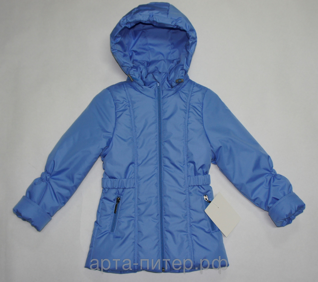 Верх-плащевка, подклад-трикотаж, наполнитель-холлофайбер (120гр), капюшон отстегивается, два боковых кармана на молниях, пояс на резинке.